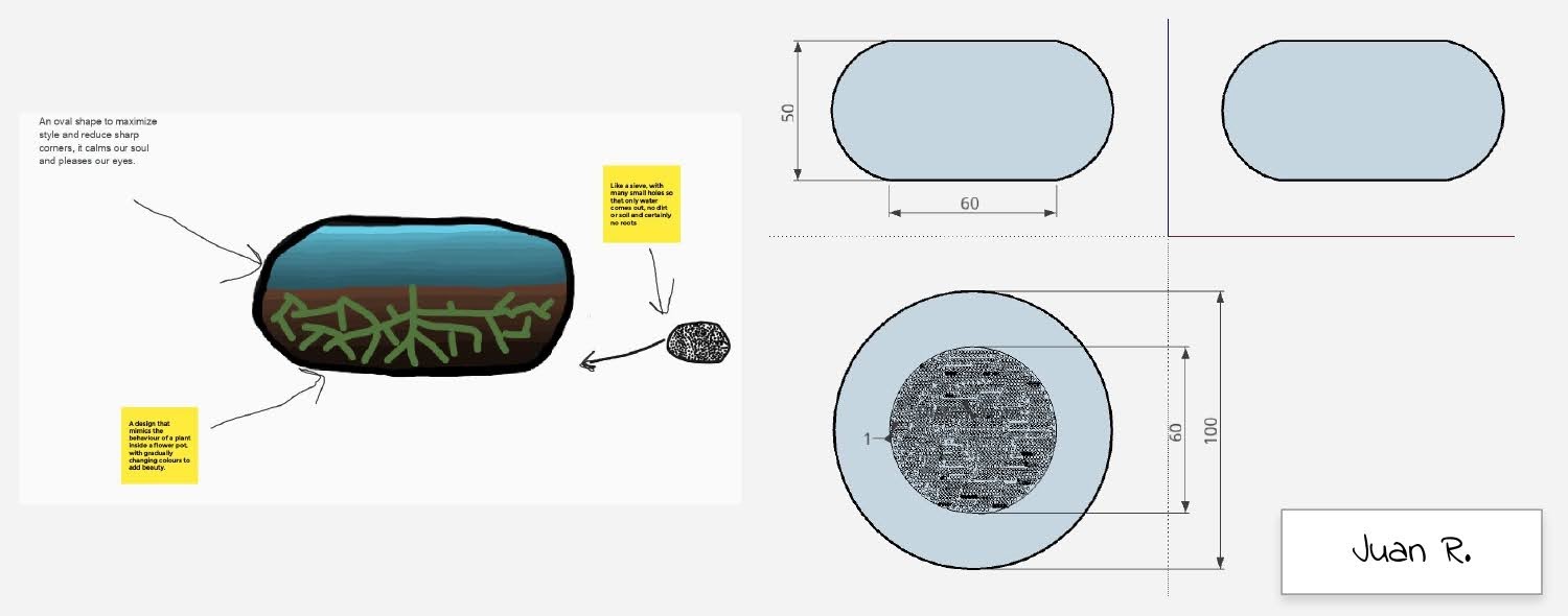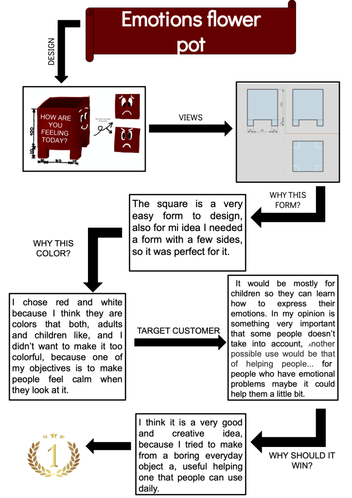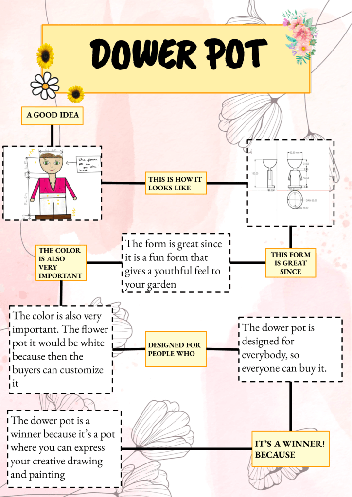 This is essentially the same process that companies go through when they design a product, the only thing we lack is testing. However, this is a simple product, so the only thing we would be testing is structural integrity and the testing will be done when the winner is chosen and the model is printed. The dimensions of the flower pot have to be limited due to the fact that they will be 3D printed, so they are 10cm tall by 10cm wide by 10cm deep at maximum.