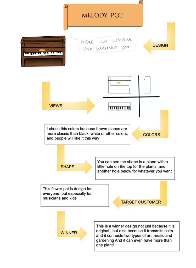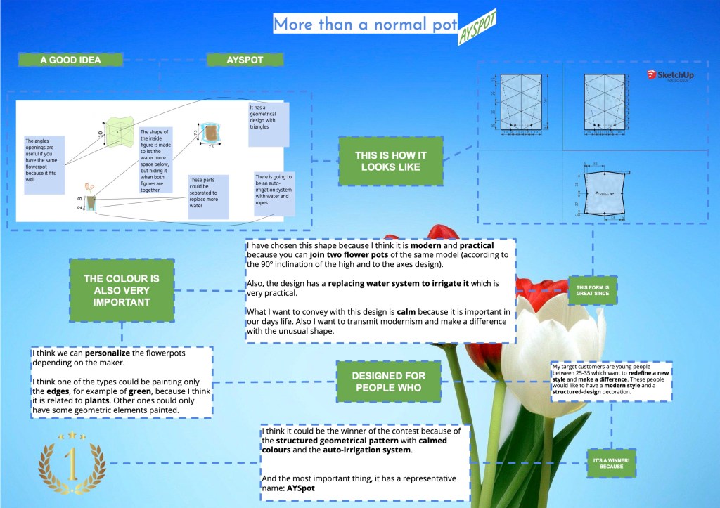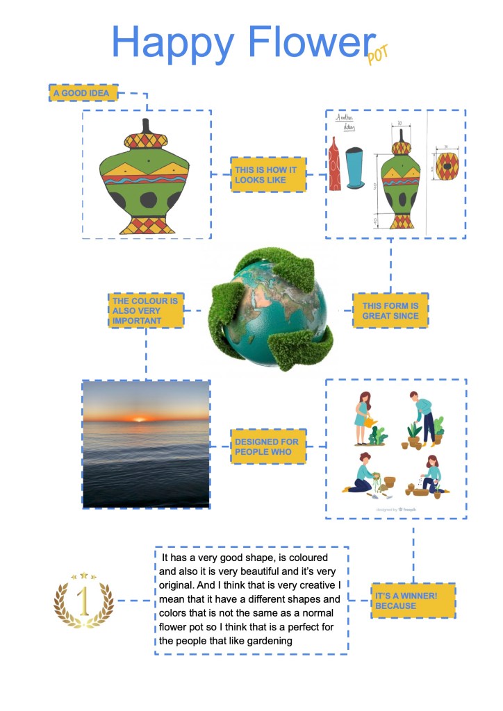After the process of development, students should tell their classmates why they should win. During their presentation in our English class, they should convey what the flower pot evokes and talk about the style or the colours. For this, students from 3rd year of ESO have practised some engagement structures. Also, they are going to show an infographic and slides to support their claim.